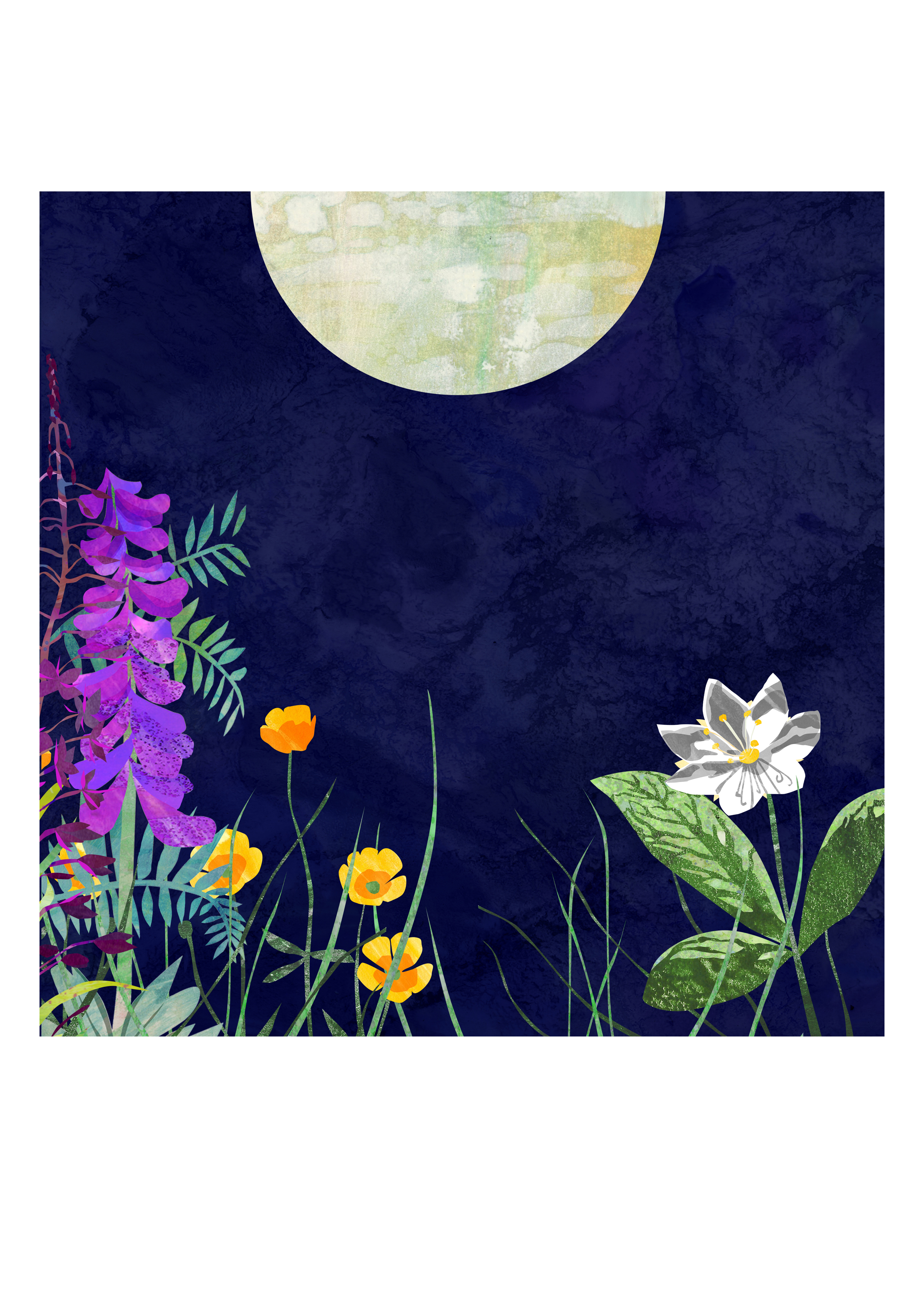 Series of digital illustrations depicting wildflowers in the moonlight.